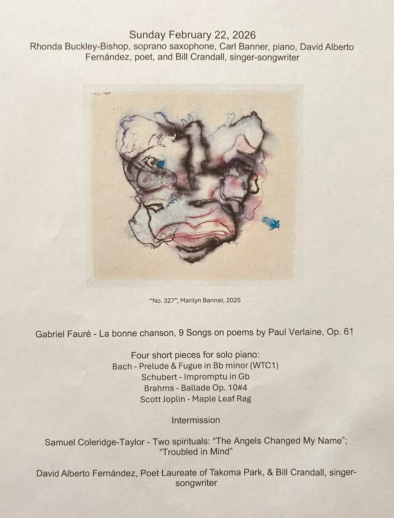They say 'pics or it didn't happen'. Well, no pics, sadly, but happen it did! As a kind of teaser for our Vocal Takoma project, David Alberto Fernández and I debuted a song-poetry hybrid in a 15 minute performance last night. It was at Washington MusicViva, my neighbors' long-running classical house concert series.